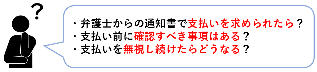 弁護士からの通知書で支払いを求められた際によくある疑問としては、以下の3つがあります。