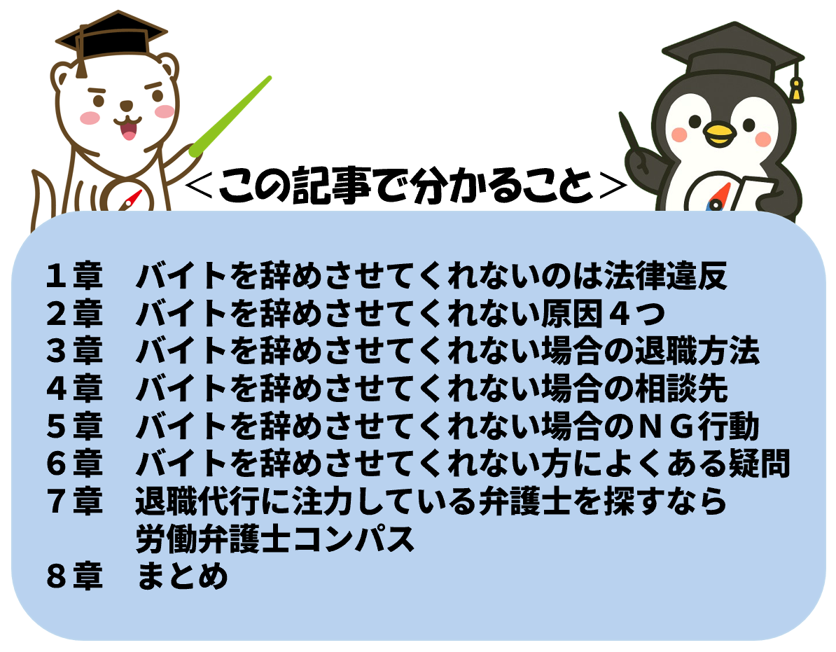 今回は、バイトを辞めさせてくれないのは法律違反の可能性があることを説明したうえで、原因4つと簡単な退職手順、バックレなどのNG行動を解説していきます。